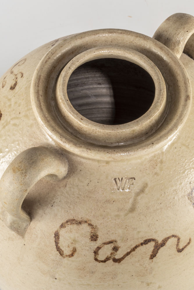 This jar, attributed to the shop of Elijah McPherson, features dramatic drips or flows of darker colors that seem to spring from each handle. These were created using the selective application of iron oxide to these areas, which naturally flowed down the vessel during firing. This jar also has “combed” sine wave incising around the shoulders, a trait that was carried by Randolph County potters to Sand Mountain, Alabama later in the 19th century. |